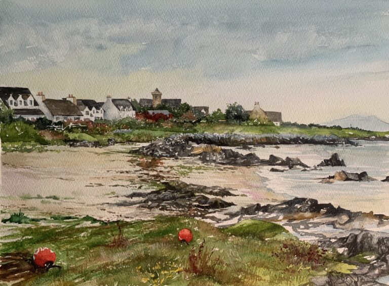 Using the dynamic medium of water, planning an approach is critical and the results can be surprising. The organic nature of water will not follow the traditional boundaries of paint and is actually sculpted and redirected on the page. Therefore, capturing the fleeting moment of a beach at sunrise, or a dancer’s gaze at her partner require keen observation and careful translation of the material to the paper.